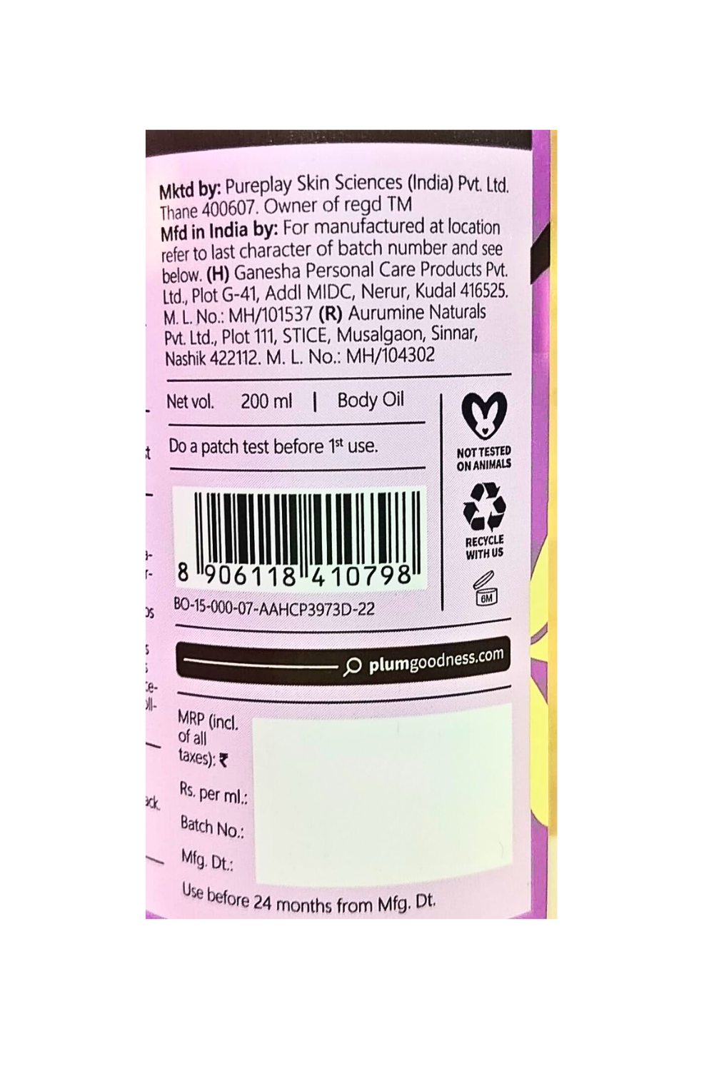 Manufactured By: (H) Ganesha Personal Care Products Pvt. Ltd., Plot G-41, Addl MIDC, Nerul, Kudal 416525 (R) Aurumine Naturals Pvt. Ltd., Plot 111, STICE, Musalgaon, Sinnar, Nashik 422112