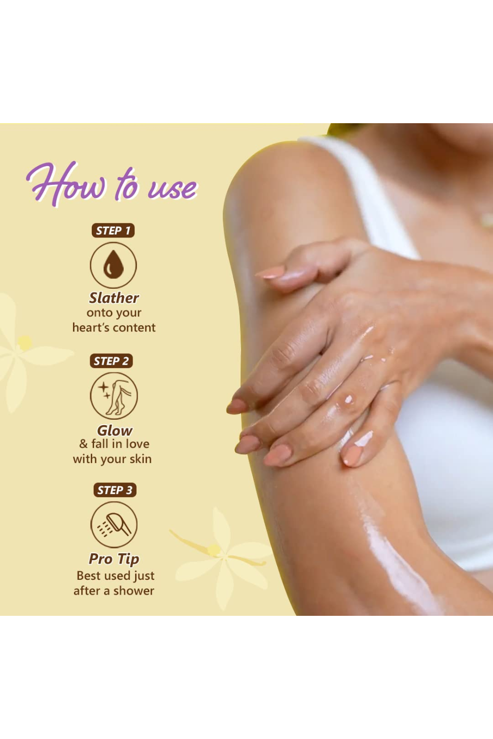 Cleanse your skin and pat dry. Squeeze a few drops of body oil on the palm of your hands. Massage gently on your skin until absorbed.