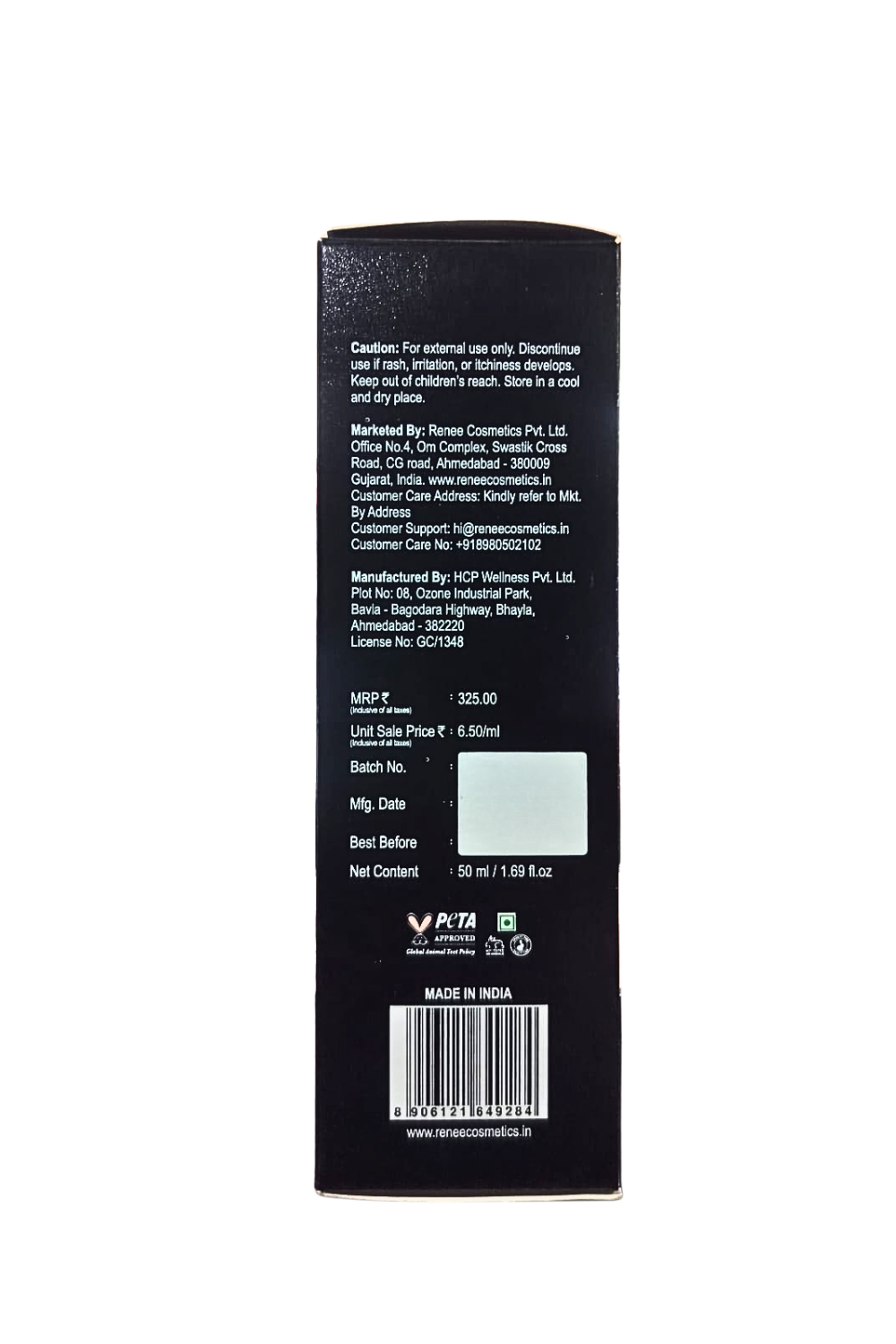 Marketed By: Renee Cosmetics Pvt. Ltd., Office No. 4, Om Complex, Swastik Cross Road, CG Road Ahmedabad - 380009, Gujarat, India.