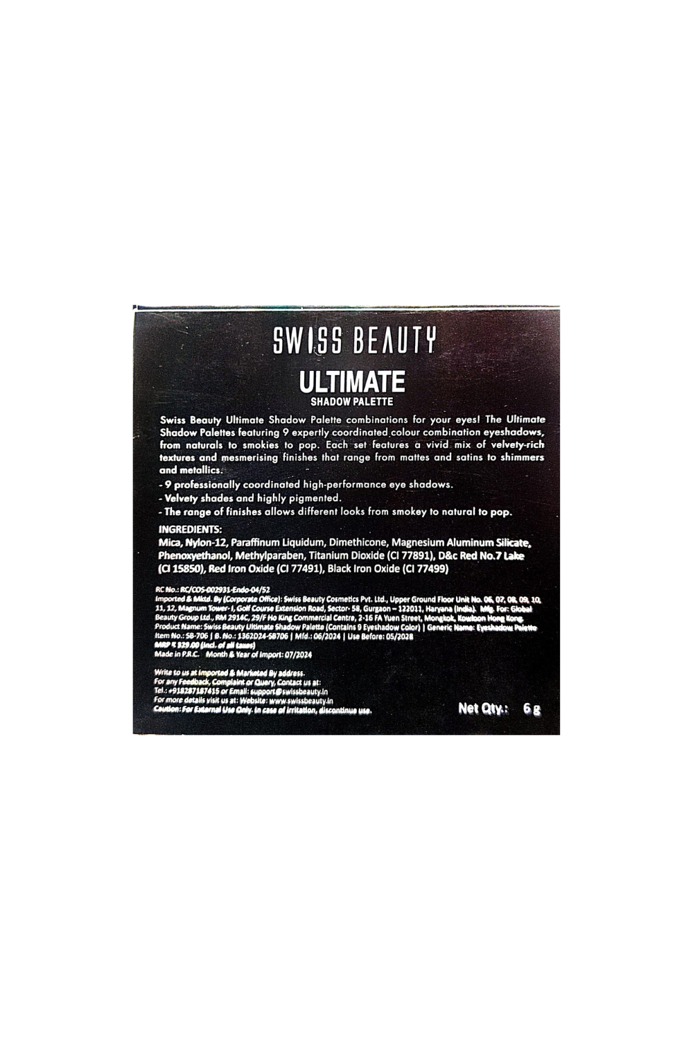 Create stunning eye looks using the Swiss Beauty Ultimate Eyeshadow Palette featuring 9 expertly coordinated colour combinations ranging from everyday naturals to vibrant colour pops. Each set features a vivid mix of velvety-rich textures and mesmerising finishes that range from mattes and satins to shimmers and metallics. Benefits: Ultra-pigmented | Mix of matte and shimmer shades | Long-wearing | One swipe application.